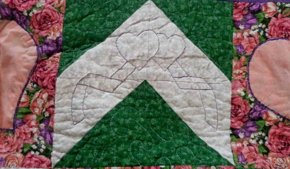 I also wanted the quilting to have meaning so…The quilting around the middle heart is quilted with pebbles as a reminder that marriage can get rocky so refer to the tips. The white is quilted with 2 hearts with ribbon as a reminder that they are forever tied in marriage. The rest is quilted with stippling referring to knowmater how you have planed your life it will wander in many different directions and throw curves at ya.