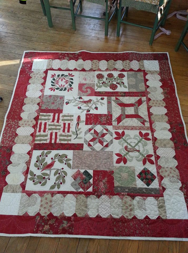 I started it shortly after receiving it and it sat in the evergrowing UFO pile. This year I figured I’m going to get rid of that pile and I got it finished. I’m not a big fan of applique but I trudged my way thru it. I did find that I like the blanket stitch way better than the satin stitch it does not make my fabric pucker. For this quilt the blanket stich gives it that old fashioned look.