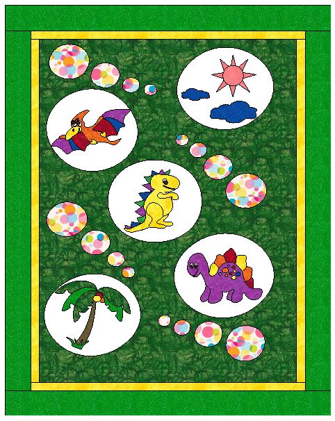 I designed the quilt on my EQ8 Program.. I’m not totally sure if I like the different set up I’m so used to the EQ7 that its taking a while to learn where everything is. Anyways this is the quilt that I designed. Last post I showed you all the apliqued blocs not yet sewn down.. This morning I finished sewing them all down. I used a Satin Stitch for the main sections of the dinosaurs I has my machine set at a width of 3 and for the eyes and small inner features I set the stitch width of 2.