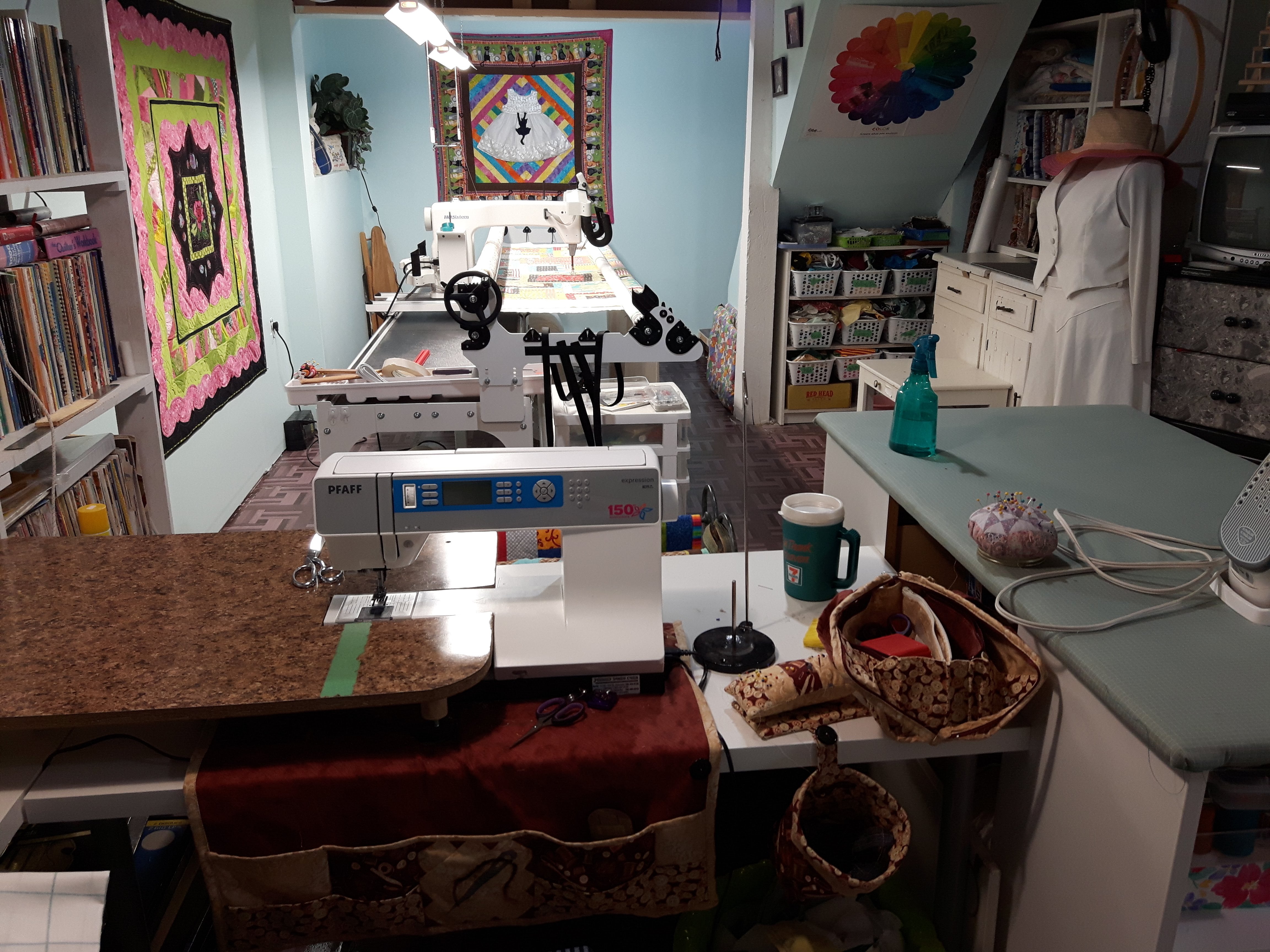 I just love your space – here in the UK most houses do not have a basement, so my sewing space is up in the loft and things are a bit tight!!! I would love to have a Longarm machine but have nowhere to put one.