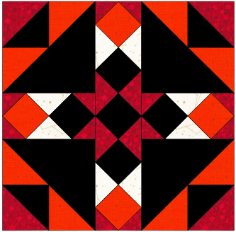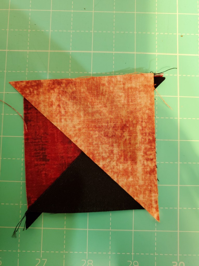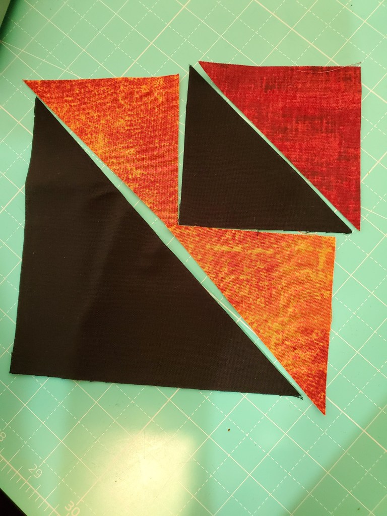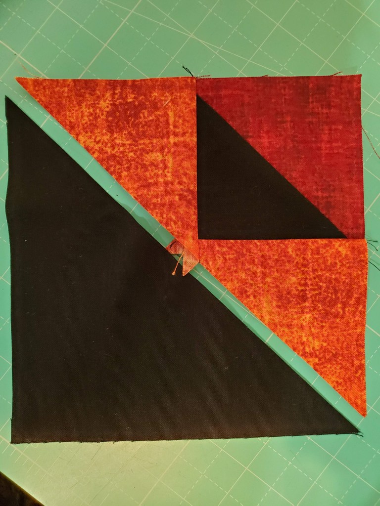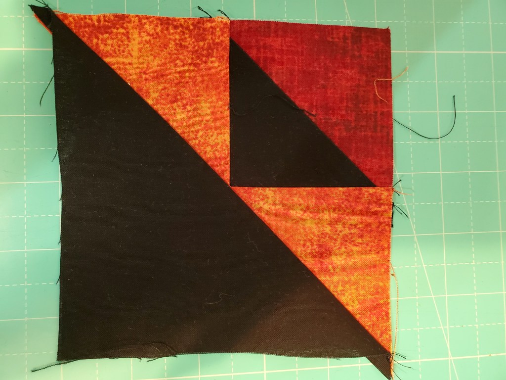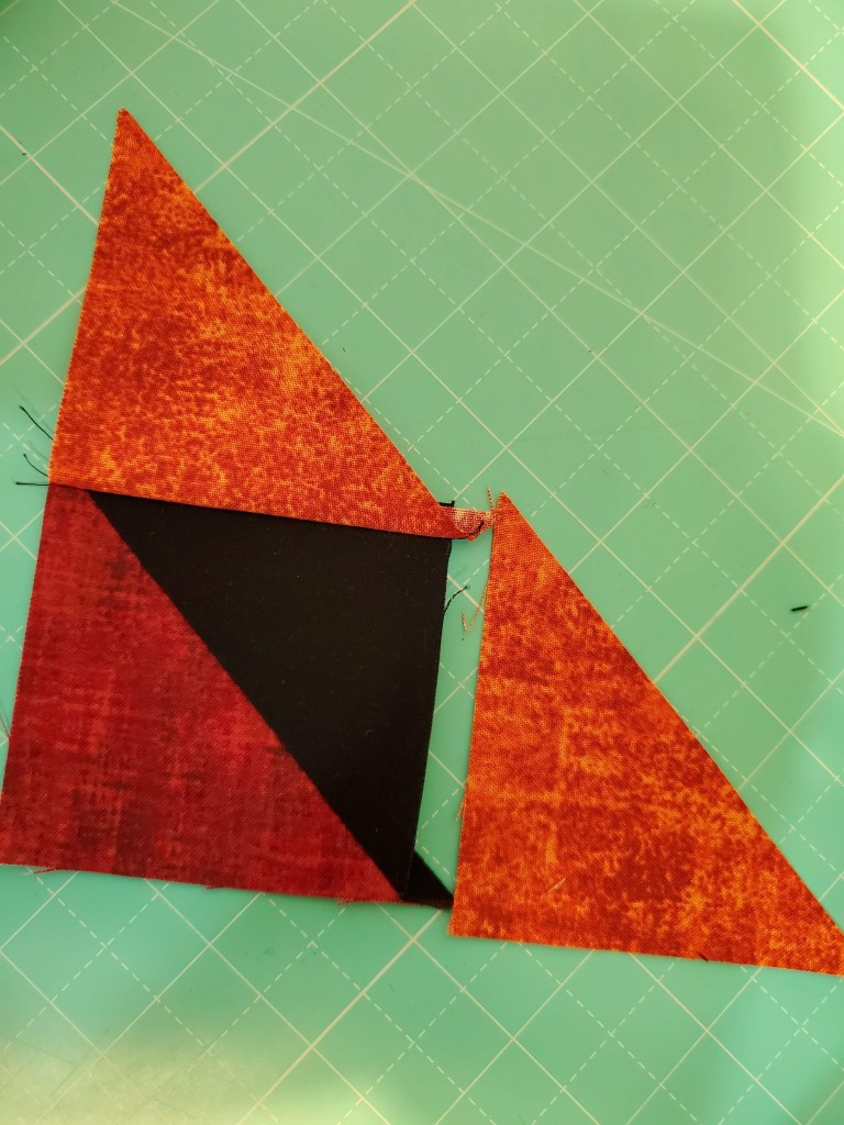 What’s left is the center cross. I’m going to start with the smallest red triangles on each side of the black and orange squares. Sew these onto the squares don’t sew the large red and white triangles yet.