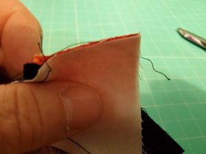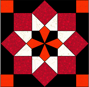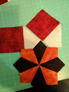 When joining the next sections to the center line up the black to the white sew the seams will but up together if you pressed to the black. Sew as far as the seam the pivot the piece and continue sewing again when at the end of the seam leave 1/4″ place to joint the outer black portions.. the next section will have you sewing the red square to the sewn on white and you’ll continue to do this all the way around leave 1/4″ at each side if these seams.