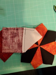 Center section. Were going to sew the right sides of the black to the orange. Be sure to leave 1/4″ at the wide part of the petal so that when doing the Y seams it will be simpler. Press to the blackNow join 2 sections to make 4 petals then join the halves use a pin to align the points. Pin on both sides of the T strait pin in the points . Press this last seam open to reduce bulk in the center. Return to design wall.