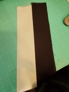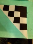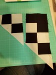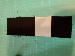 Making double patches. Sew the 5 black and 5 white strips together. Press towards the black.. I finger press 1st so that I get a good crease where the seam is then press with the iron. Sub cut the patches to size. You’ll need 60 of these sets. Double black patch need 20 of these