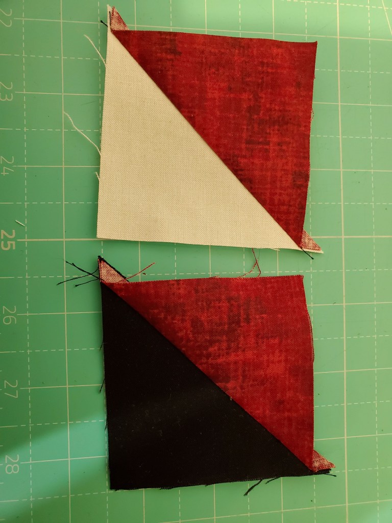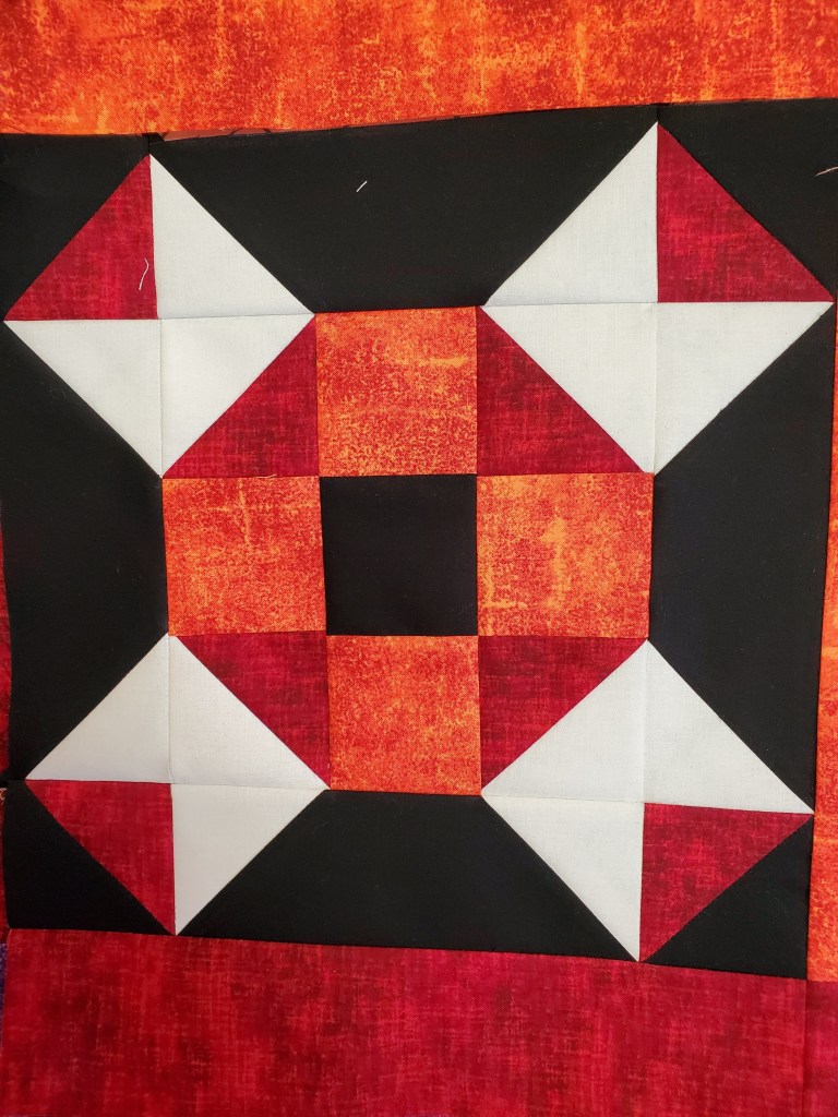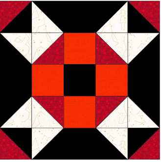 To start looking at this block to break it down, I see half square triangles: 4 black/red and 4 red/white.. Then I can see the the center is now a 9 patch.. The leftover whites triangles and trapezoids can be sewn into a a rectangle. Now again we have a 9 patch.