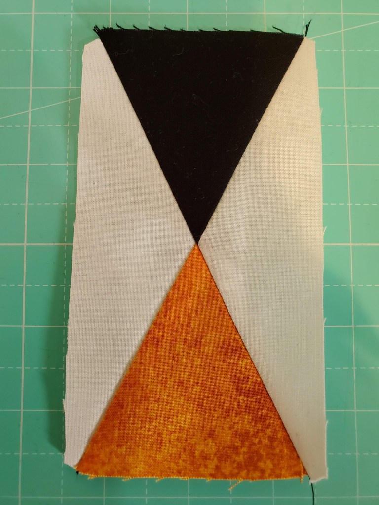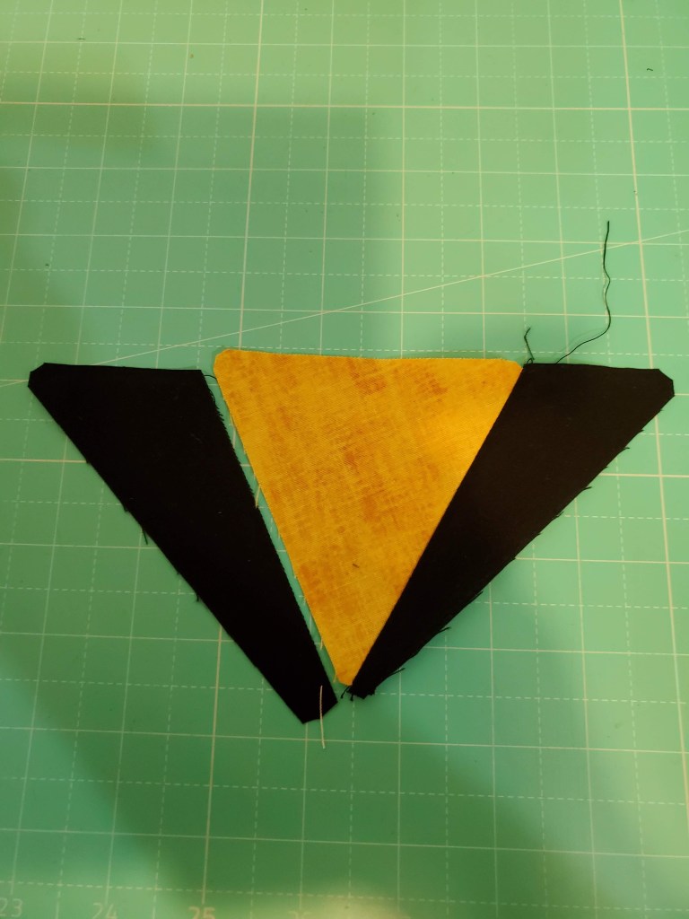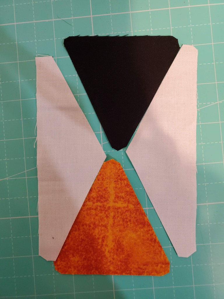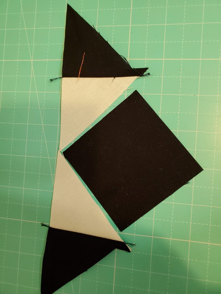 I’m going to start this block with the outer corner sections. Sew all the black and white triangles together.. watch the orientation as they are opposites for the left and right of the section. When sewing the corner squares find the center of the square and the triangle by folding. press everything to the black.