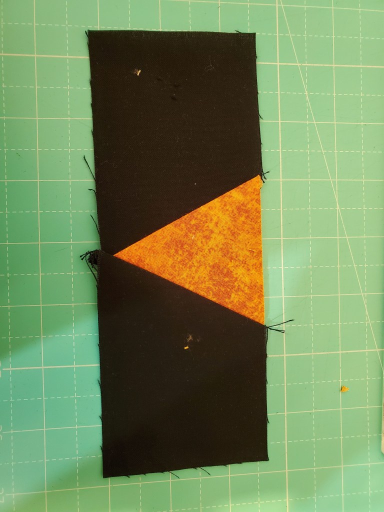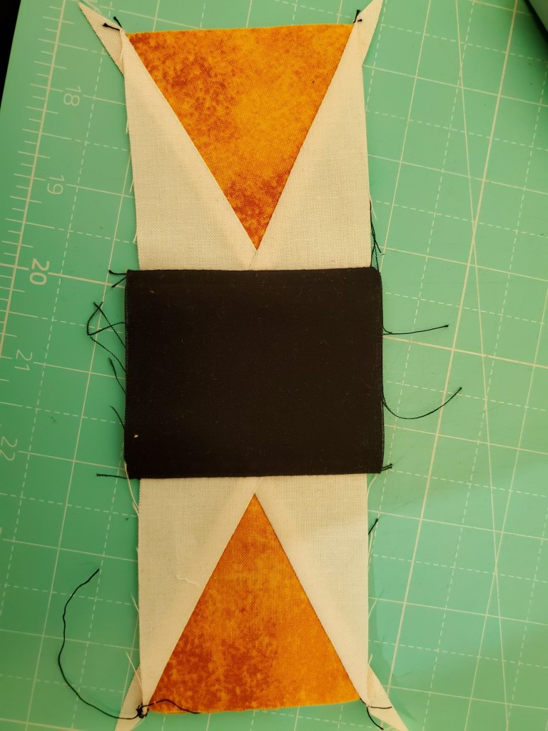 now sew the orange triangle with the black outer border shapes. sew the orange corner squares to 2 of these sections