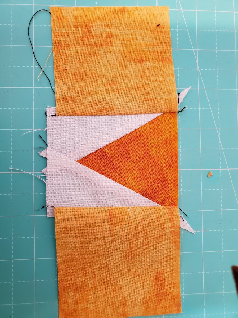 Start this block with the white star pints and dark orange. Watch the orientation of the triangle long sides sew to white patch. line up the bottom of the patch if possible.. Use the templates to get the nicely trimmed corners. sew press towards the white to lessen bulk.