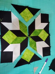 Sew the black corner square just like all previous blocks. By folding away then sewing to the 1/4″ mark and flipping and doing the same with the other side.