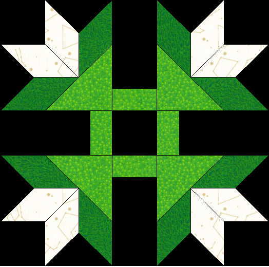 The 1st section are the 4 corner Squares. build this the same as you did with the previous blocks. Sew the white trabapids together insert the black square, now sew the green trapezoids to this section insert the black triangles, the last piece that will be sewn on is the light green triangle to finish the square. do this on all 4 corners.