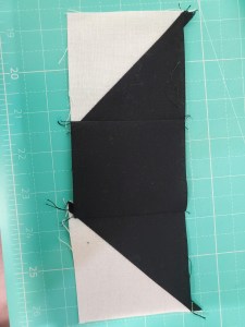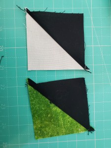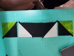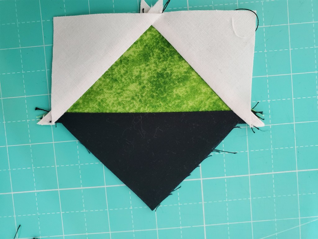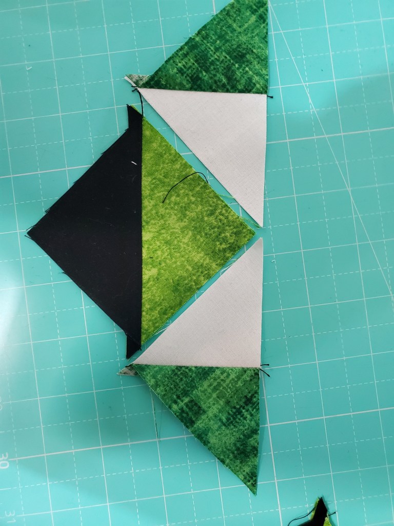 sew the green triangle to the white ones then sew them onto the green/black HST