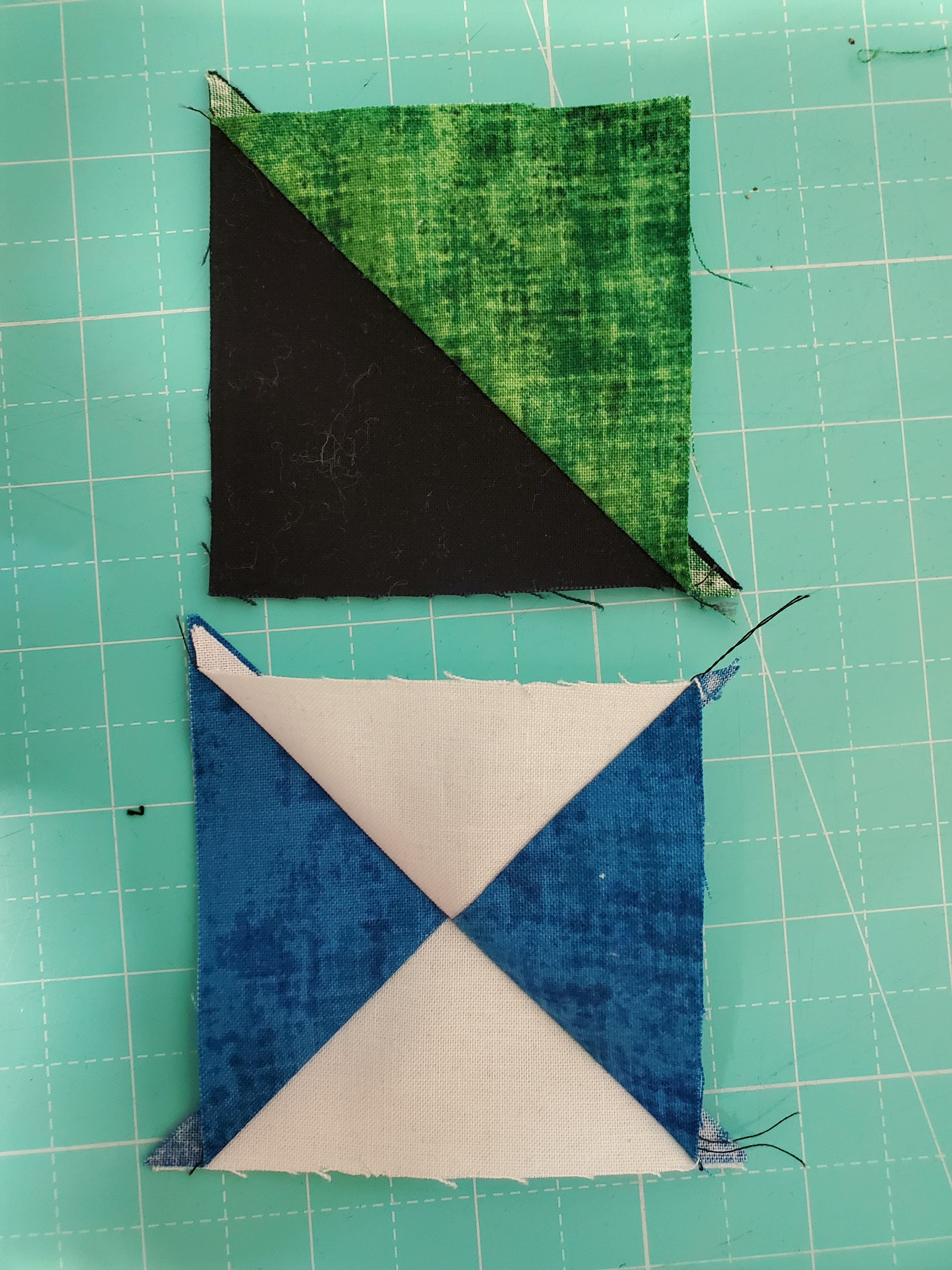 20190828_175913 August 28, 2019Full resolution (3024 × 4032) Sew the blue & white triangles together press the qst to the blue and press the HST to the 12 green