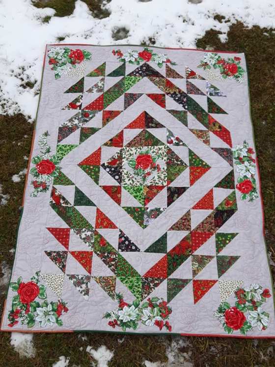 Christmas Lap Quilt, Half Square triangles, Large printed flowers